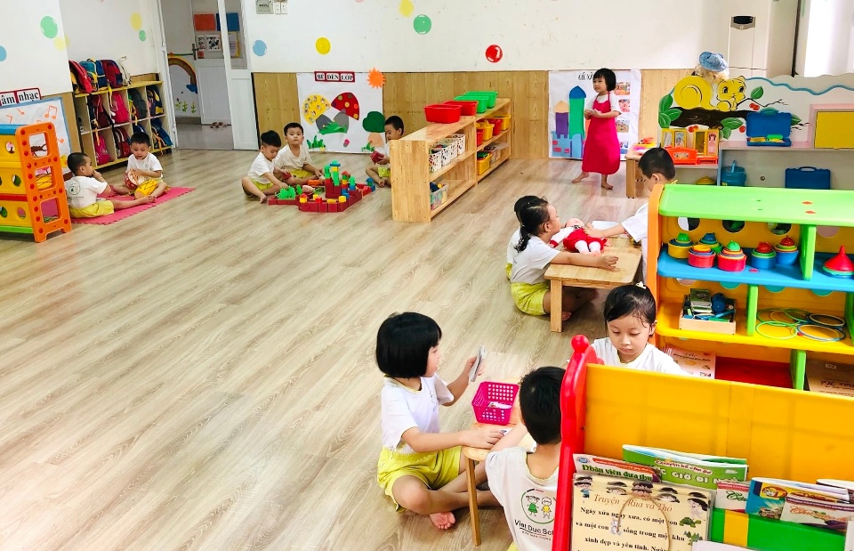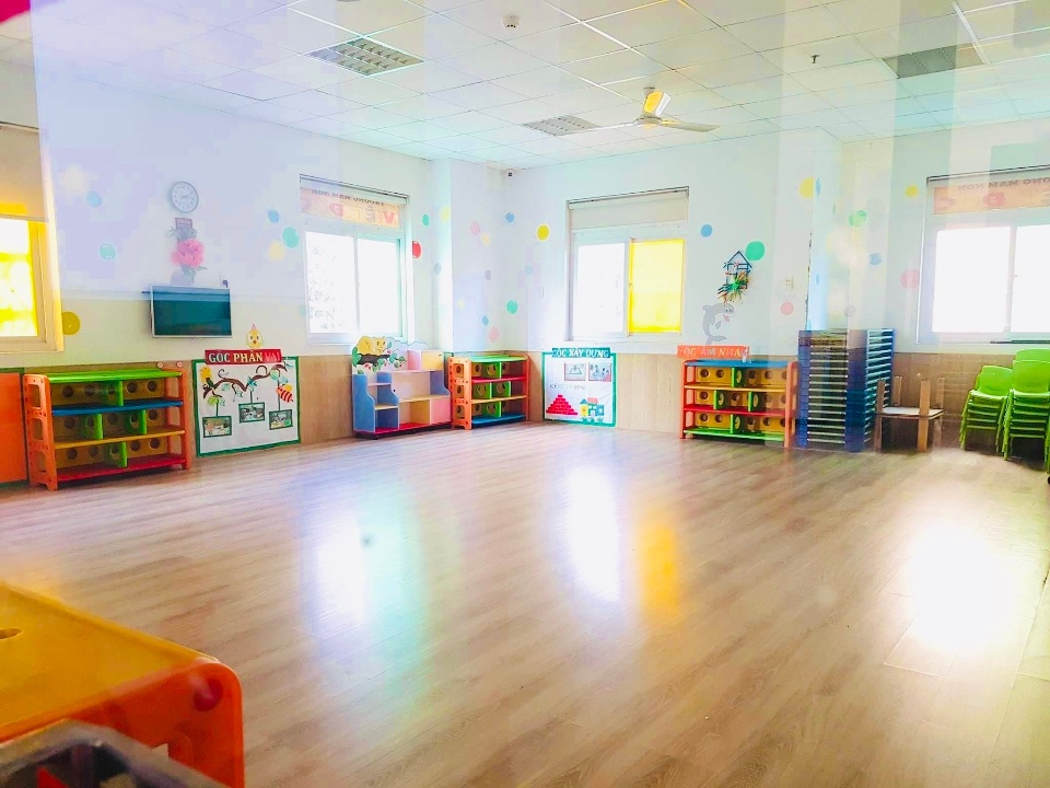 Lớp học rộng ,thoáng mát.Sàn gỗ an toàn cho bé.Trông bé cả ngày thứ 7.Giáo viên thân thiện.